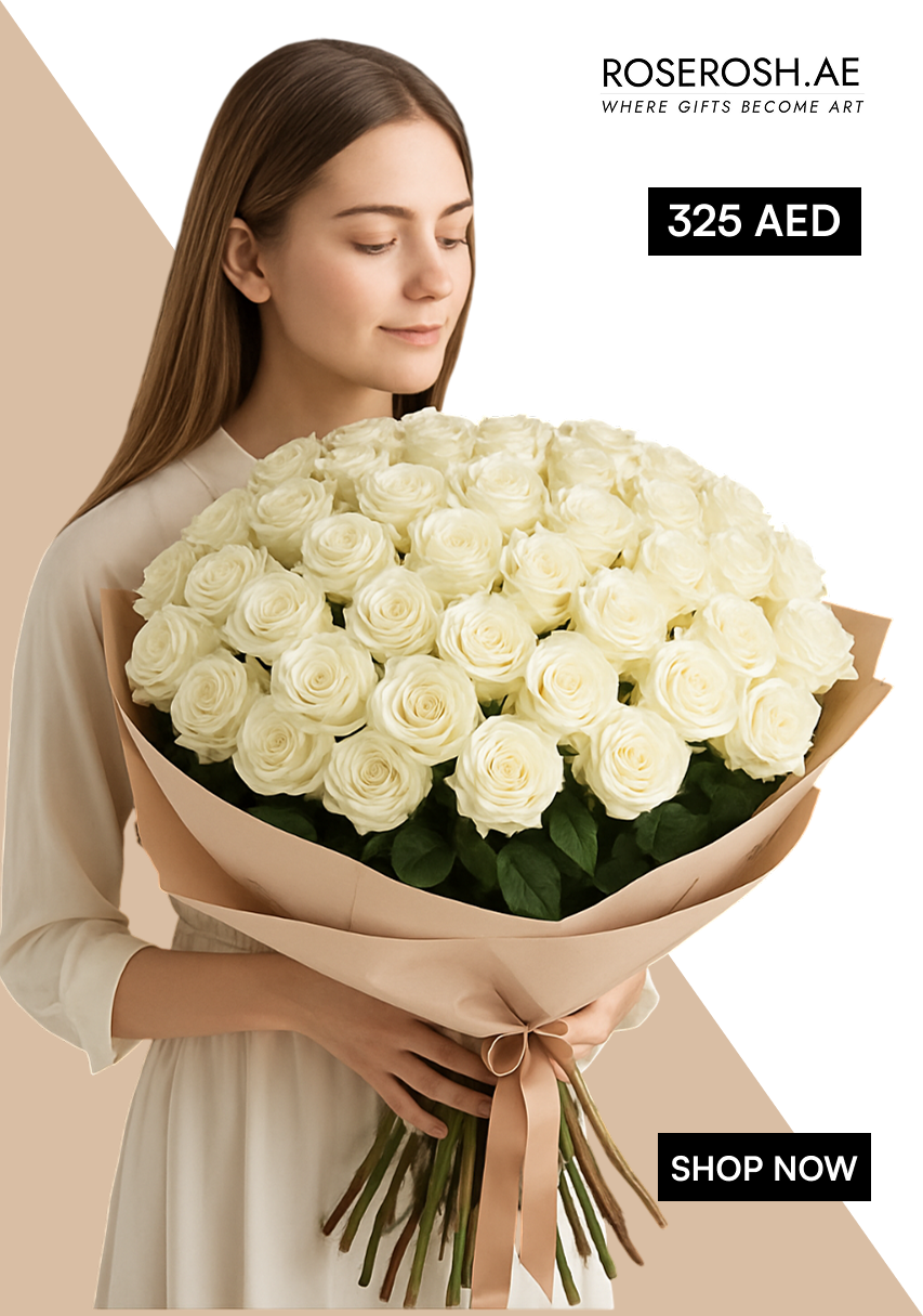 Send a message of pure love and refined beauty with our signature white roses bouquet. Order now for same-day delivery in All Emirates!